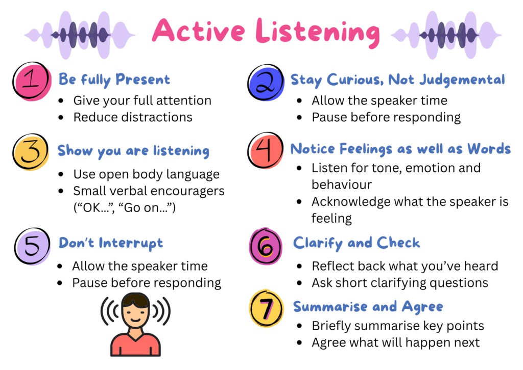 Eye contact – gentle and appropriateUse active listening: reflect back what you hear, show empathy, and demonstrate non‑judgement.